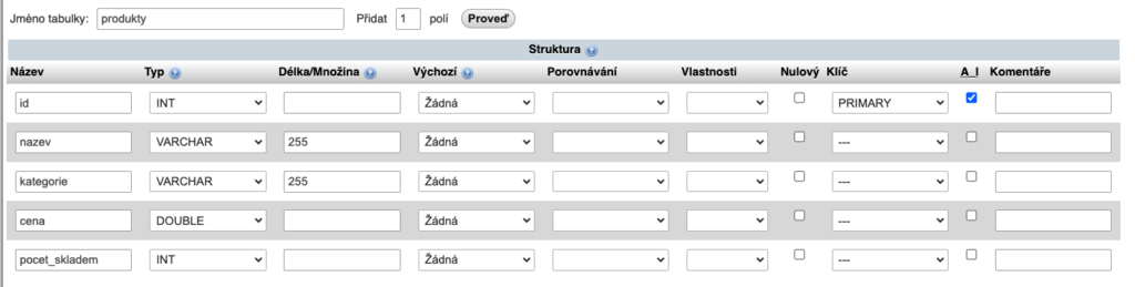 zde vyplním, nezapomenu správně vybrat datové typy, označit primární klíč, případně jestli je AI apod…
