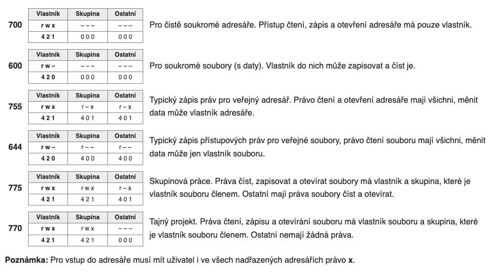 Každá skupina uživatelů (vlastník, skupina, ostatní) má své oprávnění jako součet těchto čísel:
