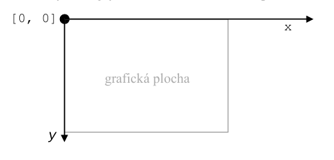 Osa x jde zleva doprava, osa y shora dolů – čím vyšší číslo, tím je níže (rozdíl oproti matematice).