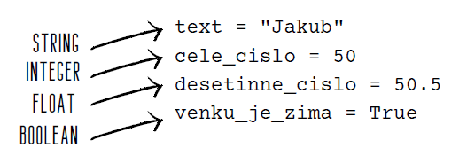 int– celá čísla (např. 1000)float– desetinná čísla (např. 1000.25)str– textové řetězce, ohraničené uvozovkamibool– logické hodnoty True / False